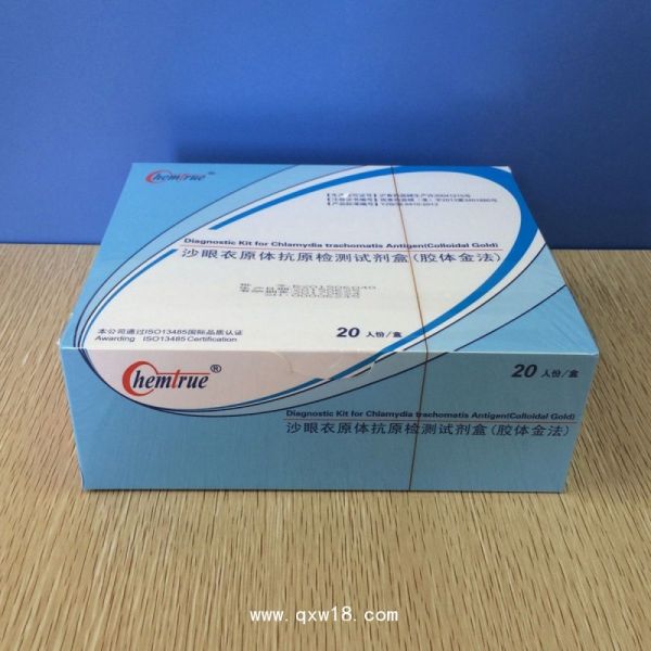沙眼衣原体抗原检测试剂盒(胶体金法)系用抗衣原体脂多糖单克隆抗体和羊抗鼠IgG多克隆抗体分别固定于固相硝酸纤维素膜,并和胶体金标记的另一抗衣原体脂多糖单克隆抗体及其他试剂和原料制成,应用胶体金免疫层析技术,采用双抗体夹心的形式建立的衣原体检测方法,用于女性宫颈和男性尿道中沙眼衣原体抗原的检测。