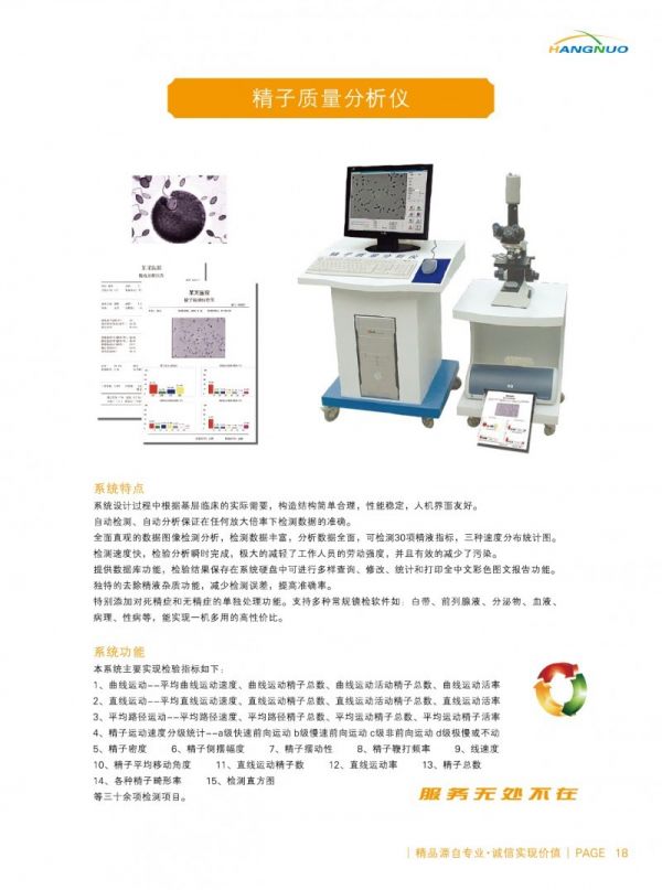 精子质量分析仪是由三目显微镜、摄像机、精子计数板、精子质量分析软件、电脑和打印机共同组成的分析设备,是精子动力学和精子形态学研究和诊断的重要工具。批准文号:冀食药监械【准】字2011第2400098号,医疗器械招商企业石家庄航诺医疗器械贸易有限公司招商产品。精子质量分析仪招商详情请进入>>