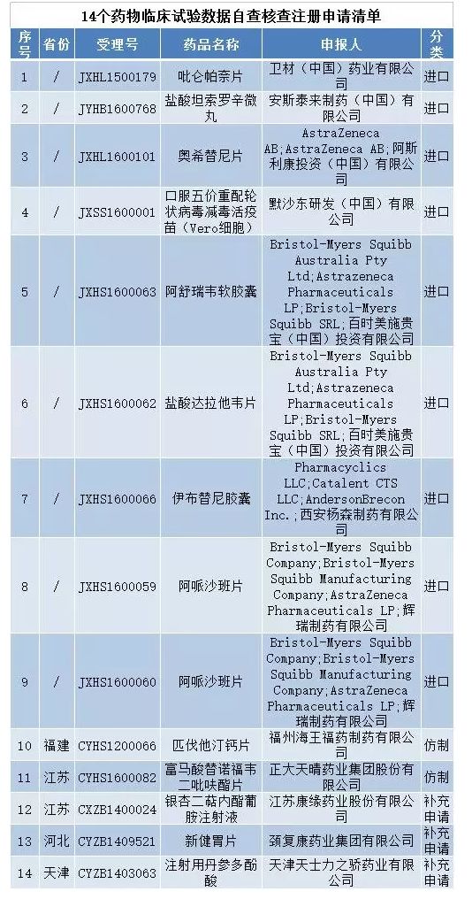 1月4日,国家食药监总局发布《关于药物临床试验数据自查核查注册申请情况的公告(2016年第202号)》,总局决定对新收到14个已完成临床试验申报生产或进口的药品注册申请进行临床试验数据核查。