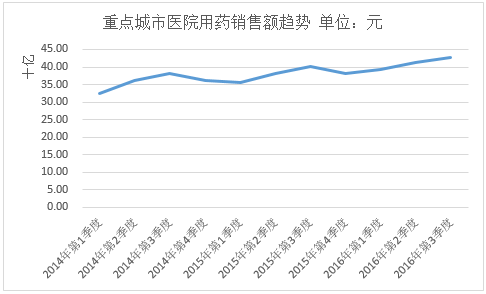 根据中国医药工业信息中心药物综合数据库PDB的统计数据,截至2016年第三季度,北京、上海、广州分别贡献了医院用药金额的14.51%、11.61%和11.36%,此外,珠三角地区也是药品费用的主要流向,占全部金额比重达16.24%。