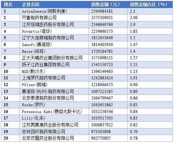 PDB数据显示,阿斯利康、齐鲁制药、江苏恒瑞等20家企业荣膺重点城市医院用药的TOP20,其中外企占比40%。而在冠亚季军的争夺中,本土企业占据两席,表现令人欣喜。