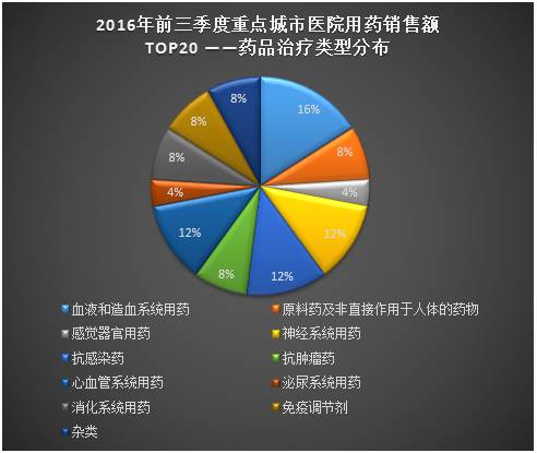 2016年前三季度重点城市医院用药产品销售额TOP20