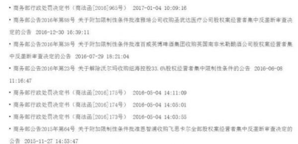 商务部一年来反垄断处罚或决定公告一览。2016年,商务部共收到经营者集中反垄断申报378件,立案360件,审结395件,均创反垄断法实施以来新高。其中,商务部共对6起案件作出处罚决定。