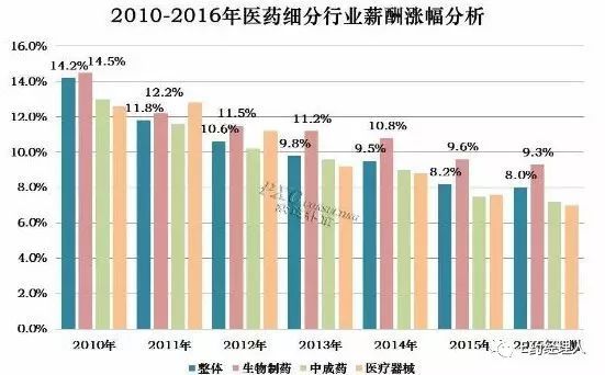 2015年医药行业景气度并不高,低位增长已经成为业界必须正视的常态。随着新医改的推行,近五年中国医药行业的平均薪酬增长率持续平稳上升,但是增长幅度已经开始下滑。据预测数据显示,2016年中国医药行业的薪酬平均增长均已经降至10%以下。