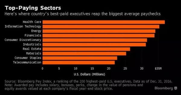 目前在已经披露收入最高的前200名高管中(因2016财年的年报尚未完全披露,排名数据以2015年财报数据为参考),制药和医疗行业高管的平均综合薪酬达到了3700万美元,位列各行业首位。这个数字比金融高管平均薪酬高出了8.6%,后者平均薪酬为3380万美元,而IT业高管则以3530万美元位居次席。