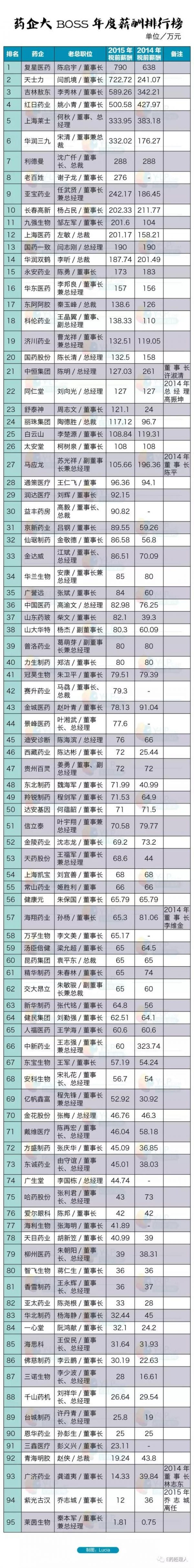 E药经理人统计了95家A股医药上市公司大BOSS们的年薪情况(包括董事长、总裁、总经理等):这95家药企大BOSS们的2015年平均年薪为112.26万元,相较于2014年平均年薪102.23万元,上涨幅度为9.8%,超过行业平均水平。