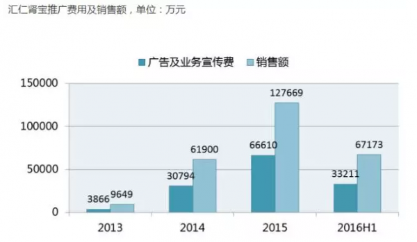 近年,汇仁药业的广告营销费用可以用暴增来形容。在2013年仅为0.38亿元的情况下,2014年就猛增到了3亿元,而2015年更是达到了6.6亿元,2016年上半年也达到了3.3亿元。