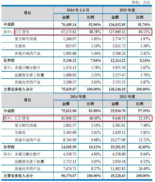 自2013年以来,汇仁药业主营产品逐渐从中成药和化学药“二分天下”,发展为汇仁肾宝单一品种占绝大优势。从2016的上半年的销售情况可以看到,汇仁肾宝已经占据去年上半年主营业务收入的88.58%。