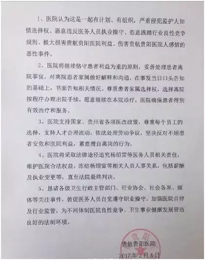 贵航贵阳医院在声明中称,目前已经向辖区派出所报警处理,同时将采取法律途径追究杨绍雷等医务人员相关责任,维护医院合法权益。