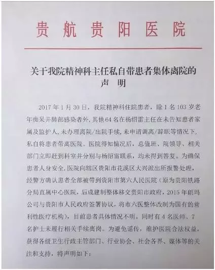 2月4日,贵航贵阳医院突然发布声明称,1月30日,该院精神科主任杨绍雷突然私下带领64名住院患者及部分医生护士出走,到贵阳市第六人民医院。