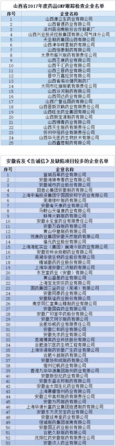 山西省食药监局采取随机摇号方式,确定了药品GMP跟踪检查25家药品生产企业的名单;而安徽省则圈定三类重点检查企业,分别是:
