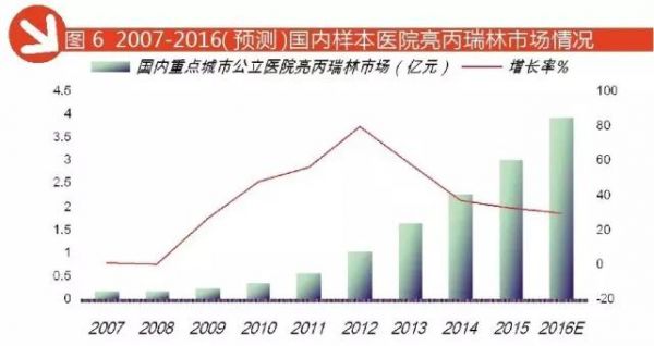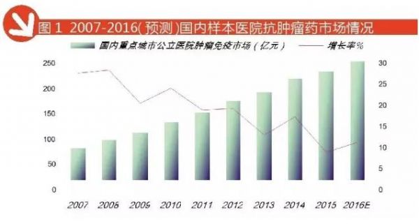 据米内网“中国城市公立医院化学药终端监测分析系统”(HDM系统)数据,2015年城市公立医院、县级公立医院、城市社区、乡镇卫生院、实体药店和网店三大终端6大市场抗肿瘤药达950亿元规模,同比上一年增长率为13.53%。保守预测2016年中国三大终端6大市场抗肿瘤市场将达到1050亿元,同比上一年增长了10.52%。