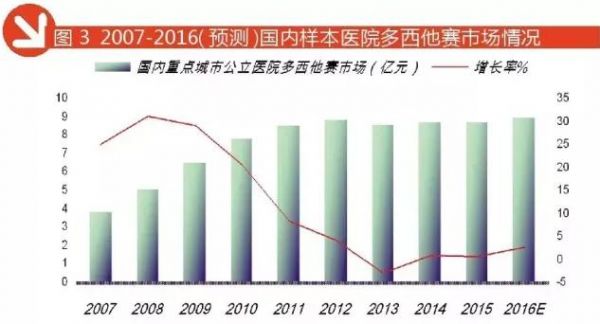 多西他赛先后在美国、日本等80多个国家相继上市,1996年进入我国开始临床验证后上市。江苏恒瑞在国内已开发获准上市,目前恒瑞的多西他赛在医院的销售额已经超过进口药物,成为销量最大的商家。