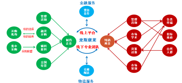 麦斯康莱上游整合约大量制药企业的产品资源,下游整合600-1000家纯销商业资源(每个地区只选择一家合作商业,而且只和有终端资源的纯销商业合作),麦斯康莱不仅为制药企业提供产品销售,还能源源不断的为合作的纯销商业提供各种需要的产品(药品、器械、耗材、保健品等)。