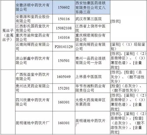 标示为安徽源和堂药业股份有限公司、广西张益堂中药饮片有限公司、江西彭氏国药堂饮片有限公司、重庆市渝和堂药业有限公司、四川欣康中药饮片有限公司、凉山新鑫中药饮片有限公司、贵州达灵药业有限公司、云南向辉药业有限公司、昆明道地中药饮片厂等企业生产的10批次菟丝子(盐菟丝子)不合格。