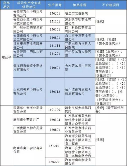 标示为海南寿南山参业有限公司、国药乐仁堂河北药业有限公司、安徽省万生中药饮片有限公司、安徽益生源中药饮片科技有限公司、亳州市中药饮片厂、广西贵港市神农药业有限公司、巴中科伦医药贸易有限公司等企业生产的13批次菟丝子不合格;