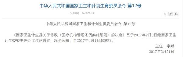刚刚,国家卫计委下发了“中华人民共和国国家卫生和计划生育委员会令 第12号”,公布了国家卫生计生委关于修改〈医疗机构管理条例实施细则〉的决定》通过,自2017年4月1日起施行。