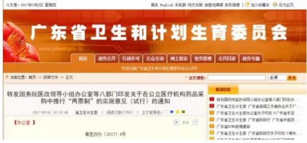 3月2日,广东省卫计委官网转发《国务院医改领导小组办公室等八部门印发关于在公立医疗机构药品采购中推行“两票制”的实施意见(试行)的通知》,这预示着,医药大省广东启动两票制的步伐在加速。