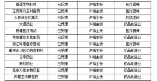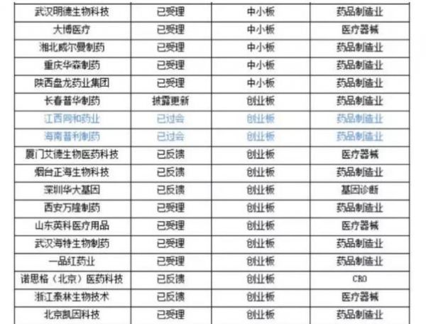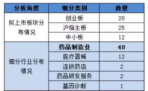 其中,从拟上市的板块来看,沪指主板20家,深圳中小板12家,创业板20家;从所属的医药行业类别来看,仍以药品制造业为主,达40家,医疗器械12家,连锁药店2家,药品研发服务(CRO)企业2家,此外还有一家我国基因基因诊断及研究服务类公司;从进度来看,截止3月11日已经过会的企业有7家,已经反馈的有17家,预披露更新的有3家,已受理的有30家。