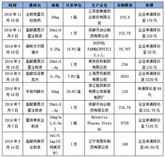 从降价幅度来看,超过50%的有DOPPEL FARMACEUTICI S.r.L. 0.25g、10片/盒的硝呋太尔阴道片,浙江医药股份有限公司新昌制药厂50mg、20片/盒的米格列醇片,辽宁海思科制药有限公司1ml:0.1mg的盐酸纳美芬注射液。2015-2016年云南省药品集中采购平台企业主动申请降价的情况如下表:
