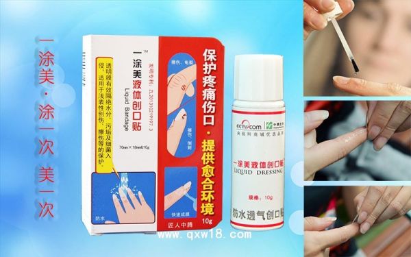 一涂美液体创口贴是采用敷垫(无纺布垫)、背贴(硝酸纤维素)和保护垫(临用前去除)组成。可用于真皮浅层及其以上的浅表性创伤、擦伤等的保护,为浅表创面、皮肤损伤提供愈合环境。该产品超薄弹性透明纤维素保护膜可覆盖患处皮肤.并迅速干透凝固.有特强持久黏贴力,可紧贴皮肤。有效隔绝并防止水分、污垢和细菌入侵伤口.保护伤口免受感染并可加速伤口愈合。可避免因煮食、清洗、游泳等活动时.伤口被水分渗入或异物摩擦而产生的痛楚。