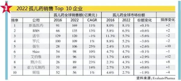 此外,百时美施贵宝(Bristol-Myers Squibb)、诺华(Novartis)、罗氏(Roche)和强生(Johnson & Johnson)将在这份排序名单上紧随新基医药之后。EvaluatePharma在报告中预测,百时美施贵宝的检查点抑制剂药物Opdivo将成为2022年欧洲市场上最畅销的孤儿药。