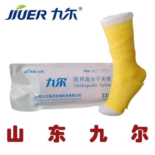 (九尔)医用高分子夹板产品由由6-8层涂聚氨酯胶的玻璃纤维布反复折叠及无纺布外保护层构成,外侧衬布具有良好的吸水性和透气性,便于夹板充分均匀地遇水活化,保证短时间内完全固化。内侧衬布属于拒水抗菌基布。医用高分子夹板由高密度聚酯和聚氨酯胶合成压制而成,材质轻便透气,使用前只需用常温水活化, 固化后强度是石膏的10倍以上。医生操作和拆除简单、患者感觉轻便、透气、舒适于一体的完美统一。