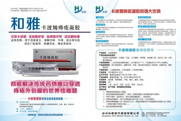 卡波姆痔疮凝胶用于创面愈合。缓解内痔、外痔、混合痔引起的肛门坠胀疼、粘膜充血、便血等症状。批准文号:豫食药监械(准)字2014第2640307号,医疗器械招商企业郑州和雅医疗器械有限公司招商产品。卡波姆痔疮凝胶招商详情请进入>>