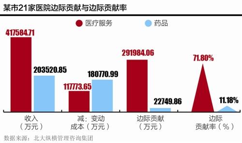 北大纵横对21家公立医院财务数据测算发现,医院卖药在经济上是不划算的,以药补医违背经济规律,如果降低药品成本、提高医疗服务价格,可以做到保持医院收入不变,而收益倍增。其计算依据是经济学上的边际收益率,这个数值越高,代表越有利可图。