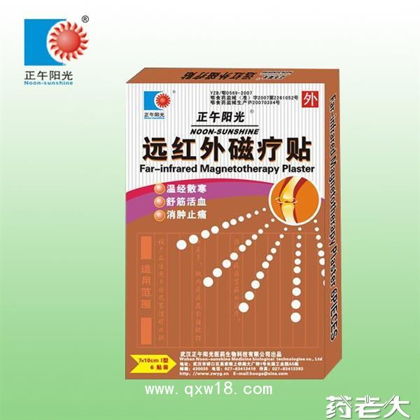 远红外磁疗贴适用于因风寒湿邪所致的关节、肌肉疼痛及软组织挫伤所致疼痛等症的治疗。本品以无纺布或织物为背衬层,远红外微粉、磁片、医用胶等为表面涂层及离型纸为防粘层组成。 批准文号:鄂食药监械(准)字2014第2261052号,医疗器械招商企业武汉正午阳光医药生物科技有限公司招商产品。远红外磁疗贴招商详情请进入>>