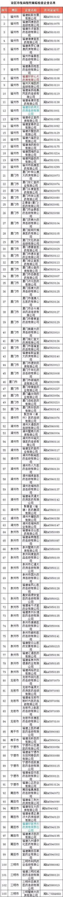 注:福建好安心大药房有限公司同时也在《省认证审评中心组织跟踪检查批发企业名单》中;福建好药师大药房连锁有限公司分别在福州市、莆田市两个地区的检查名单中。