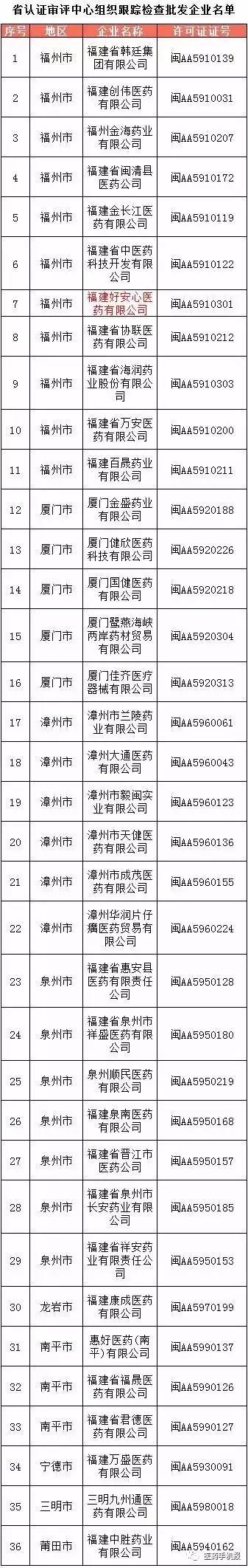 注:福建好安心大药房有限公司同时也在《设区市级局组织跟踪检查企业名单》中。