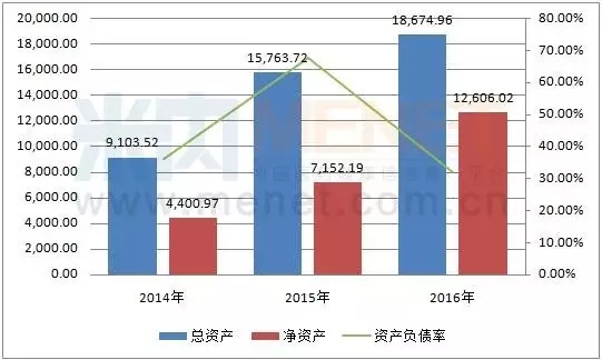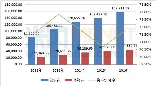 据年报数据显示,从2013年起,国药控股的总资产已经突破了千亿关口,并逐年上涨,2016年超过了1577亿元;净资产也是逐年上升,2016年为445.32亿元;而最近五年的资产负债率则一直保持在70%左右。