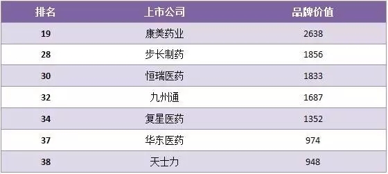表2:2017中国上市公司品牌价值榜民营榜TOP50中入围的医药企业(单位:百万元)