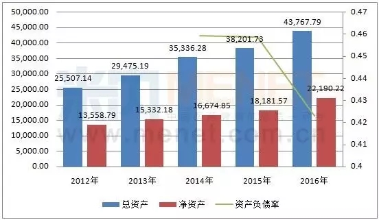 复星医药的业务领域覆盖医药健康全产业链,业务发展立足中国本土并积极进行全球化布局。最近几年,复星医药的资产情况都有逐年上涨的趋势,2016年总资产已经超过了437亿元,净资产也超过了221亿元,资产负债率下降至42.31%。