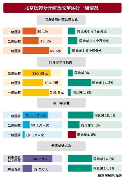 北京市卫计委昨天发布的统计数据显示,从4月8日零时至4月15日24时,北京医药分开综合改革实施一周来,全市221家纳入监测的医疗机构药占比及药费均呈下降趋势,在就诊人数方面,二级、三级医院门急诊量有所下降,一级医院和社区卫生服务中心门急诊量则有所上升。“看专家难”有所缓解。