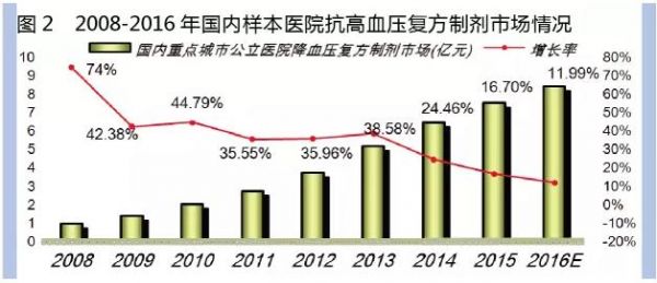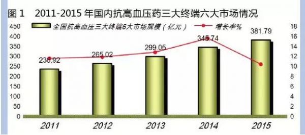 据南方医药经济研究所数据库数据,2015年中国城市公立医院、县级公立医院、城市社区、乡镇卫生院、实体药店和网店三大终端6大市场高血压药物销售额为382亿元,同比上一年增长了10.72%。