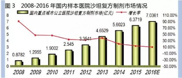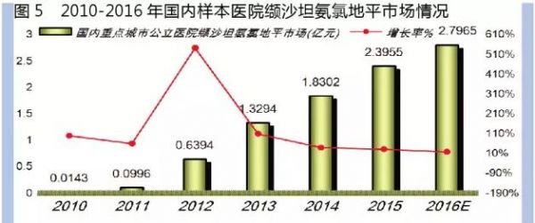 预测2016年国内重点城市公立医院固定剂量的复方ARB制剂用药金额为7.04亿元,同比上一年增长10.42%。2011-2016年年平均增长率达24.86%,是复方抗高血压市场的领军品种。