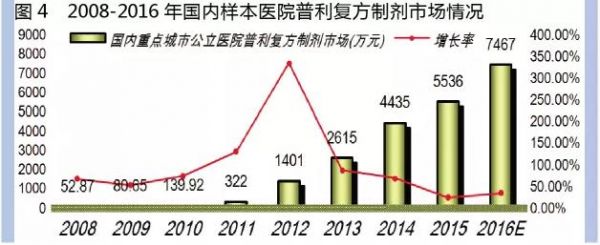 据米内网HDM系统2016年前3季度数据,临床使用的抗高血压固定复方制剂已有20个药物,主要品种呈现增长态势。预测2016年国内重点城市公立医院固定剂量的复方抗高血压制剂用药金额为8.43亿元,同比上一年增长11.99%。2011-2016年五年年平均增长率达29.28%,国内复方抗高血压制剂市场已达60亿元规模,预测近两年将突破百亿元大关。