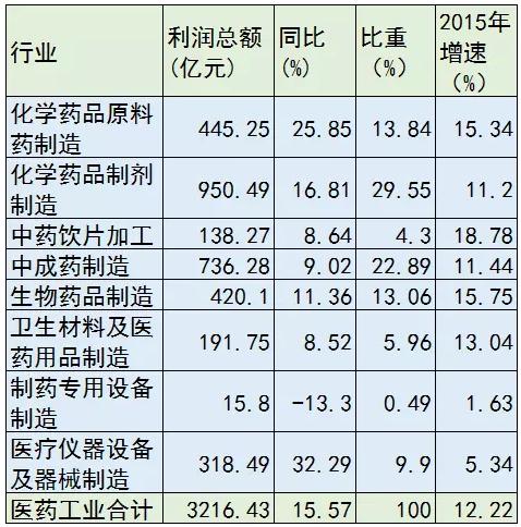 2016年医药工业规模以上企业实现利润总额3216.43亿元,同比增长15.57%,增速较上年同期提高3.35个百分点,高于全国工业整体增速7.07个百分点。各子行业中,增长最快的是化学原料药,制药设备出现负增长。2016年规模以上医药工业主营收入利润率为10.85%,较上年有所提升,高于全国工业整体水平4.88个百分点。
