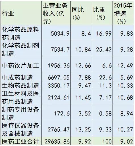 2016年医药工业规模以上企业实现主营业务收入29635.86亿元,同比增长9.92%,增速较上年同期提高0.90个百分点,增速高于全国工业整体增速5.02个百分点。各子行业中,增长最快的是医疗仪器设备及器械制造,化学原料药、中成药、制药设备的增速低于行业平均水平。