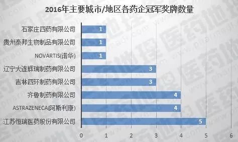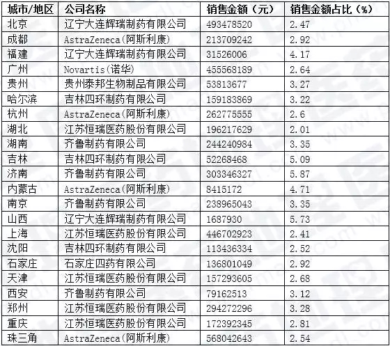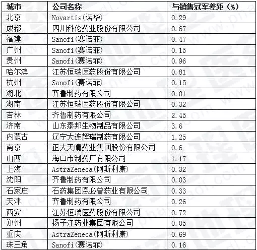 2016年,8家制药企业占据了22个城市/地区销售冠军的位置。其中,吉林四环制药有限公司称霸了东北三个主要城市。而北上广和珠三角地区的销售第一分别由辽宁大连辉瑞制药有限公司、江苏恒瑞医药股份有限公司、Novartis(诺华)和AstraZeneca(阿斯利康)夺得。