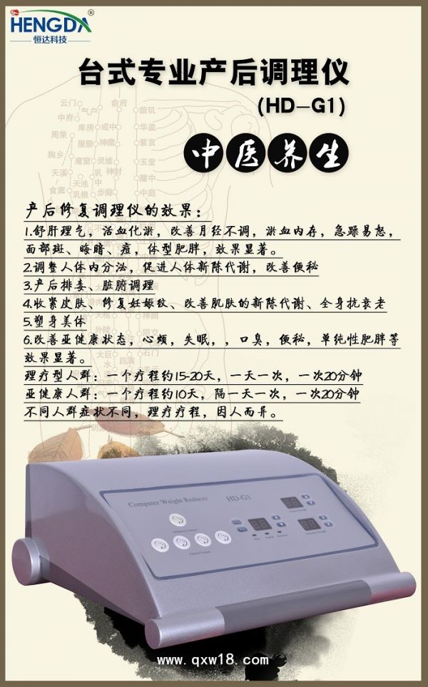 中医经络疗法已有几千年的历史,而中医经络理疗仪进行经络治疗也是近几年才研发的高科技产品。由于它操作简便、绿色安全、效果确切,优于刮痧、拔罐、针灸等其他经络疗法,因而深受国内外客户的欢迎。产后修复调理仪对穴位进行一定的刺激,使经络穴位因刺激而血脉畅通,行气活血,以内养外,表里同调,标本兼治,达到消斑除痘,润泽肌肤,延缓衰老,健康与兼得久效。由于操作简便、快捷、舒适,效果显著,绿色安全、无副作用,深受国内外客商的喜爱。月子康复理疗仪招商详情请进入>>