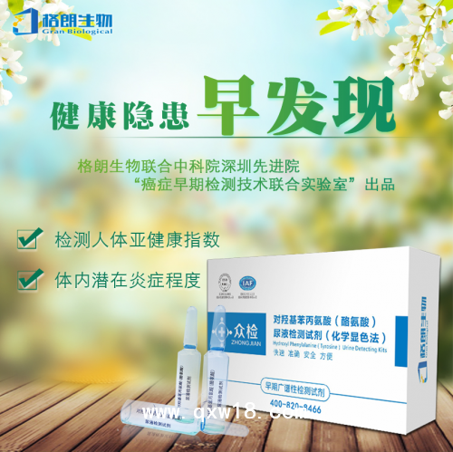 “众检”,即:对羟基苯丙氨酸(酪氨酸)尿液检测试剂,用户只需3毫升尿液,3至5分钟即可定性诊断是否患有重大代谢类疾病或癌症,经过中国医学科学院肿瘤医院,浙江大学医学院附属第一医院、江西省肿瘤医院、陕西省肿瘤防治研究所基础研究室、河南中医学院第二附属医院等权威机构的7000余例临床验证,其阳性符合率高达87.78%,阴性符合率达到97%,特别是对于目前临床多发的消化系统,呼吸系统癌症和妇科常见癌症等有更好的筛查结果,其中消化系统癌症的灵敏度高达90%。适用于各级医院临床检测和大范围人群进行癌症筛检普查工作。还可用于细胞内代谢异常类疾病筛查的辅助诊断指标,对那些已经做完切除手术的癌症患者,“众检”检测试剂同样可以快速、准确、全面的定性诊断身体各部分是否还有癌细胞残留,及时判断治疗效果。