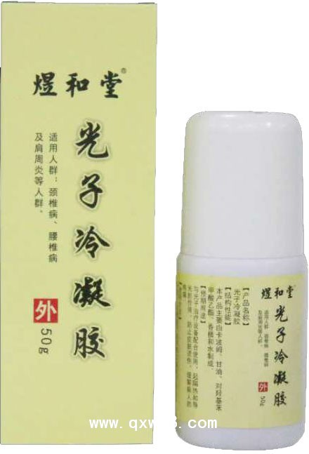 光子冷凝胶是专门针对颈椎病、腰椎病及肩周炎辅助治疗的产品。本产品原本为浓稠液体,涂到人体皮肤后8到10分钟自干成膜(每瓶可涂抹上百次),且本产品兼顾前期缓解疼痛治疗及后期恢复治疗,颈椎病重患者使用本产品10分钟后即可缓解疼痛,每天使用8次以上,一周后症状即可消失,后期恢复治疗每天涂抹3到5次即可。第一代光子冷凝胶需要配合医疗器械使用,而目前生产的光子冷凝胶为第二代,光子冷凝胶本身添加了热源,无需配合医疗器械单独使用就可以了。