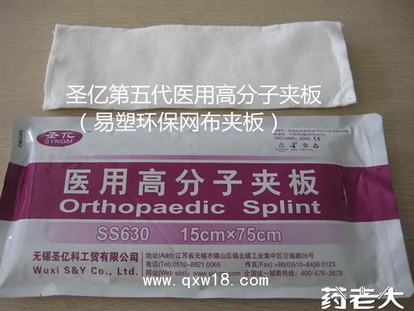 圣亿第五代医用高分子夹板:由上层薄的无纺布和中间7-8层网状聚酯布涂胶及内层白色无纺棉布构成。产品用途适用范围:骨科外固定、整形外科的矫形具。用于内固定术后的保护和制动。用于骨科、手外科的骨折、扭伤、软组织、关节韧带肌腱等术后固定、制动。用于整形外科的骨、关节矫形术后、烧伤等整形术后的固定、制动。性能特点: