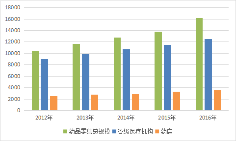 首先是整体药品零售市场的规模,据中商产业研究院的数据,2015年国内药品终端销售规模为1.38万亿,从三大终端来看,第一终端公立医院占比69%,第二终端零售药店终端占比22%,第三终端公立基层医疗终端占比9%,整体呈7:2:1的比例。
