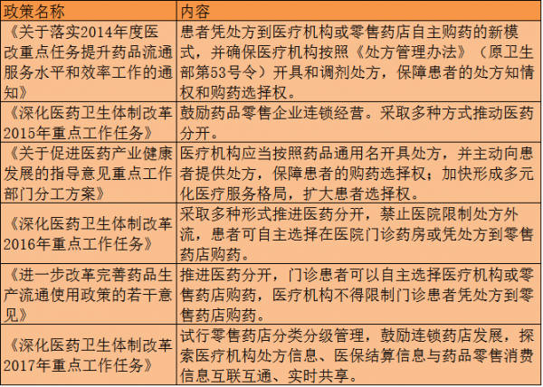 在实施“医药分开”综合改革的过程当中,处方外流或院外处方流转是其中一项重点内容,意即此前由医院药房承担的药品供给、药事服务等要逐渐释放到以零售药店为主的其他药品流通渠道,保障患者购药需求。