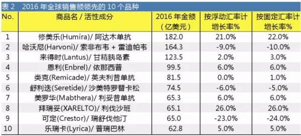 2016年全球销售额领先的10个品种见表2,领先的10个品种销售额占市场份额的9.7%(983.3亿美元/10,098.0亿美元)。