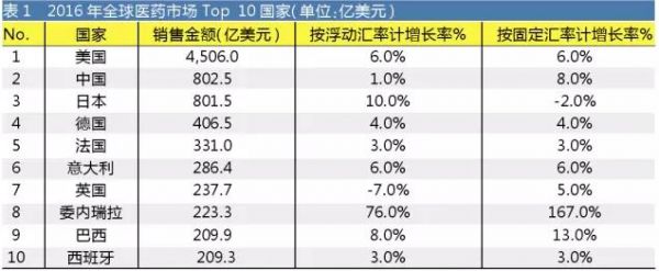 作为国际主流医药市场,美国一直遥遥领先于其它各国医药市场。据统计,2016年美国医药市场规模达4506.0亿美元,同比增长6.0%(见表1)。